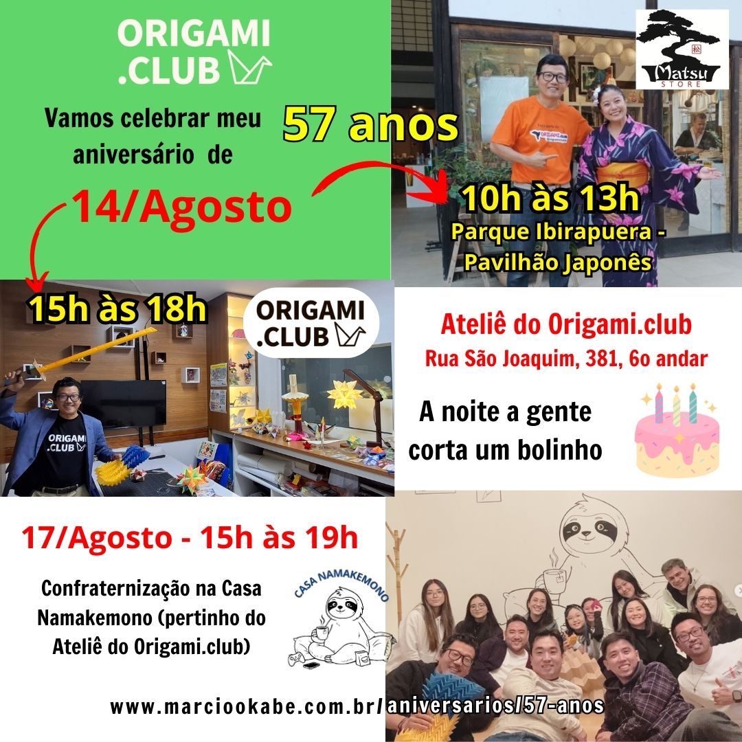 No dia 14 de agosto, completo 57 anos e vou comemorar de um jeito DIFERENTE: fazendo origami e compartilhando histórias no Pavilhão Japonês do Parque Ibirapuera e no nosso ateliè do Origami.club no prédio do Bunkyo (onde fica o Museu da Imigração Japonesa). No dia 17/Agosto farei uma celebração na Casa Namakemono mais reservada. Agenda: 14/Agosto10h às 13h – Pavilhão Japonês do Ibirapuera15h às 18h – Ateliê do Origami.club 17/Agosto15h às 19h – Casa Namakemono Pavilhão Japonês do Ibirapuera Quinta-feira é entrada Read more about Aniversário de 57 anos[…]