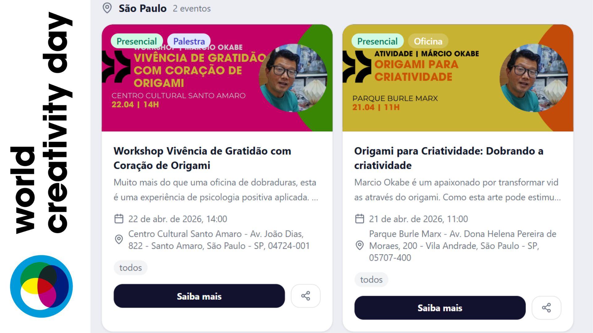 Origami para Criatividade – Avião Bumerangue 21 de abril de 2026 – 11:00 – 12:00Parque Burle Marx – Av. Dona Helena Pereira de Moraes, 200 – Vila Andrade, São Paulo – SP, 05707-400São Paulo https://wcomembers.nozcomunidades.com.br/events/25f08391-f3e4-48e9-98ee-34d9efc31b6f Transforme uma simples folha de papel em uma experiência de criatividade, conexão e reflexão! Nesta vivência de origami, você vai aprender a fazer o avião bumerangue — aquele que vai e volta — como uma metáfora da própria vida. ✈️ Read more about Origami no WCD (World Creativity Day) 2026[…]