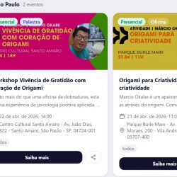 Origami para Criatividade – Avião Bumerangue 21 de abril de 2026 – 11:00 – 12:00Parque Burle Marx – Av. Dona Helena Pereira de Moraes, 200 – Vila Andrade, São Paulo – SP, 05707-400São Paulo https://wcomembers.nozcomunidades.com.br/events/25f08391-f3e4-48e9-98ee-34d9efc31b6f Transforme uma simples folha de papel em uma experiência de criatividade, conexão e reflexão! Nesta vivência de origami, você vai aprender a fazer o avião bumerangue — aquele que vai e volta — como uma metáfora da própria vida. ✈️ Read more about Origami no WCD (World Creativity Day) 2026[…]